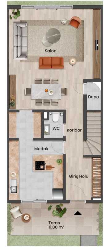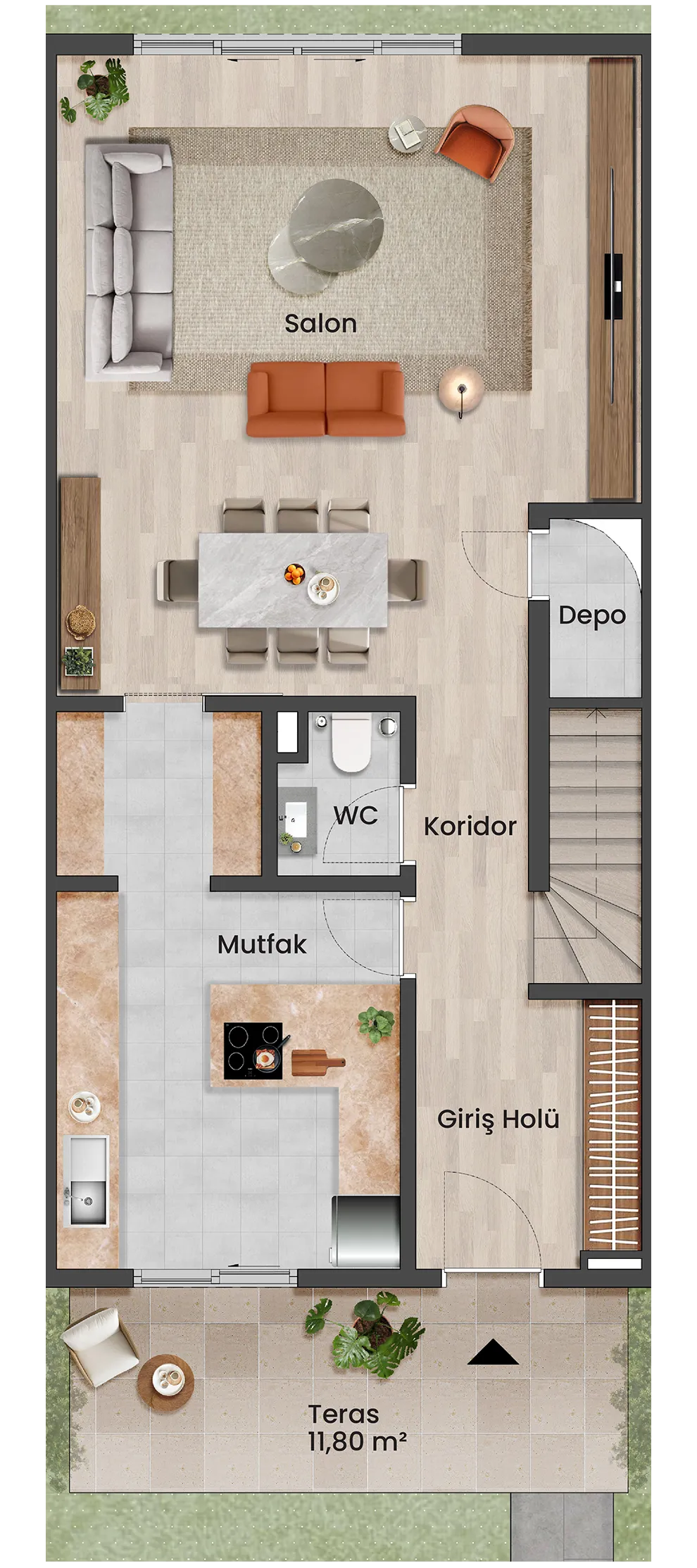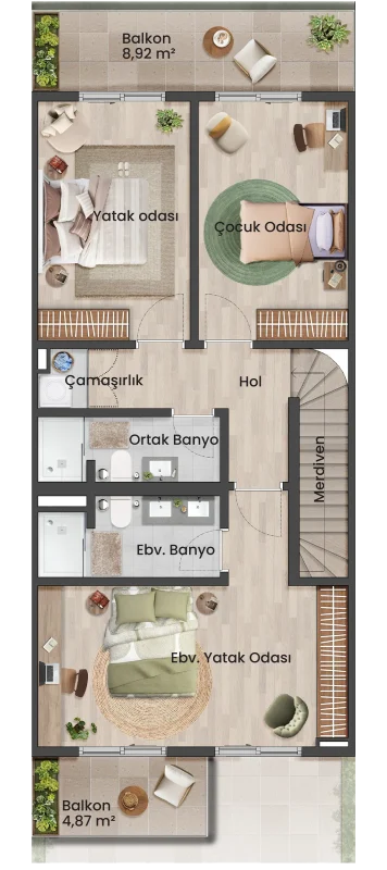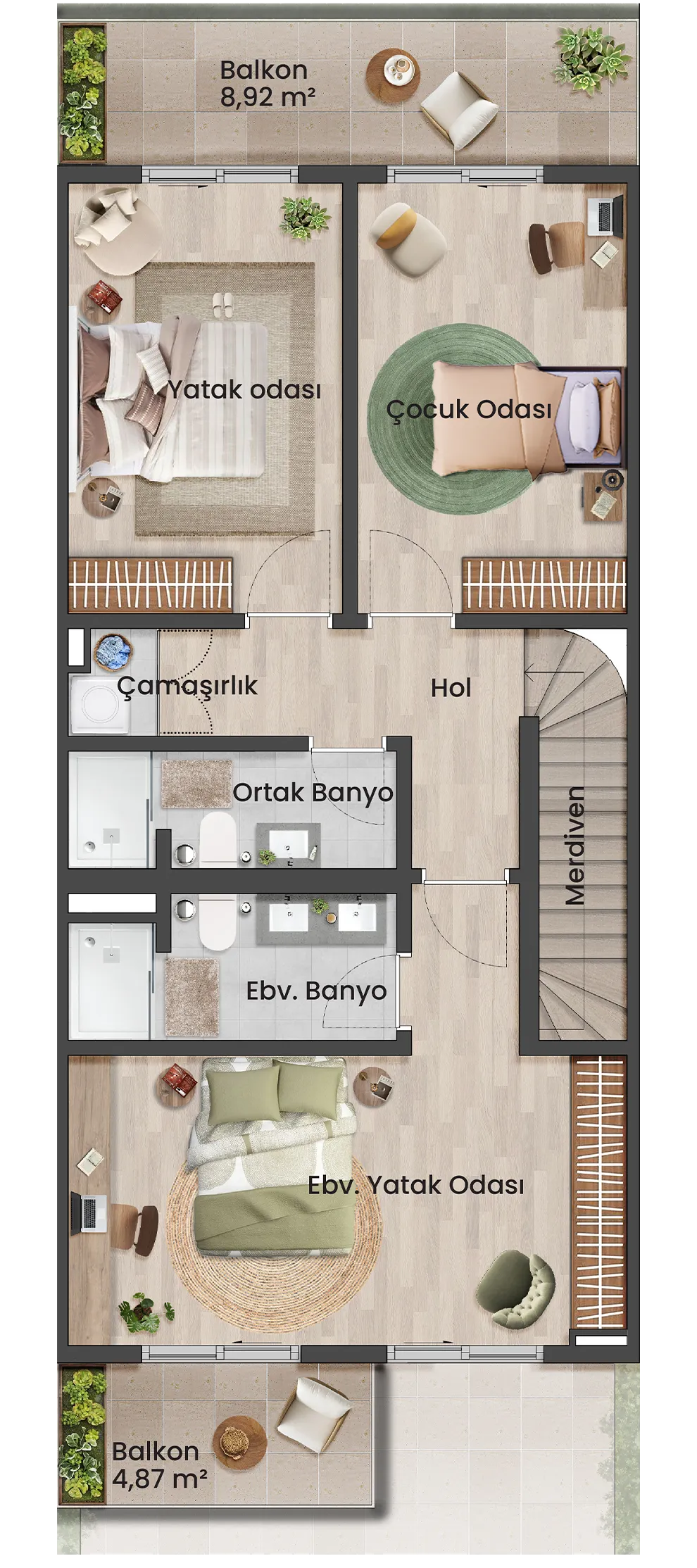 Anasayfa / Villa Tipleri / Sıra Dubleks - Ara (3+1) Sıra Dubleks - Ara (3+1) 3+1 Bahçeli Dubleks Ev 2 Banyo - 1 WC 2 Adet Kapalı Otopark (Tahsisli) Brüt 16 m² Kapalı Depo 65 - 125 m² Arasında Değişen Bahçe Net Alan: 122 m²Brüt Alan: 188 m² Blok Alt Kat Planı Blok Üst Kat Planı Alt Kat Planı ALT KAT NET ALAN Mutfak 15,62 m² WC 1,79 m² Giriş Holü + Koridor 8,72 m² Depo 1,26 m² Salon 33,59 m² Toplam 60,98 m² ÜST KAT NET ALAN Ebv. Yatak Odası 18,50 m² Ebv. Banyo 4,52 m² Çocuk Odası 12,25 m² Yatak Odası 12,04 m² Ortak Banyo 3,78 m² Hol + Merdiven + Çamaşırlık 10,16 m² Toplam 61,25 m² Üst Kat Planı